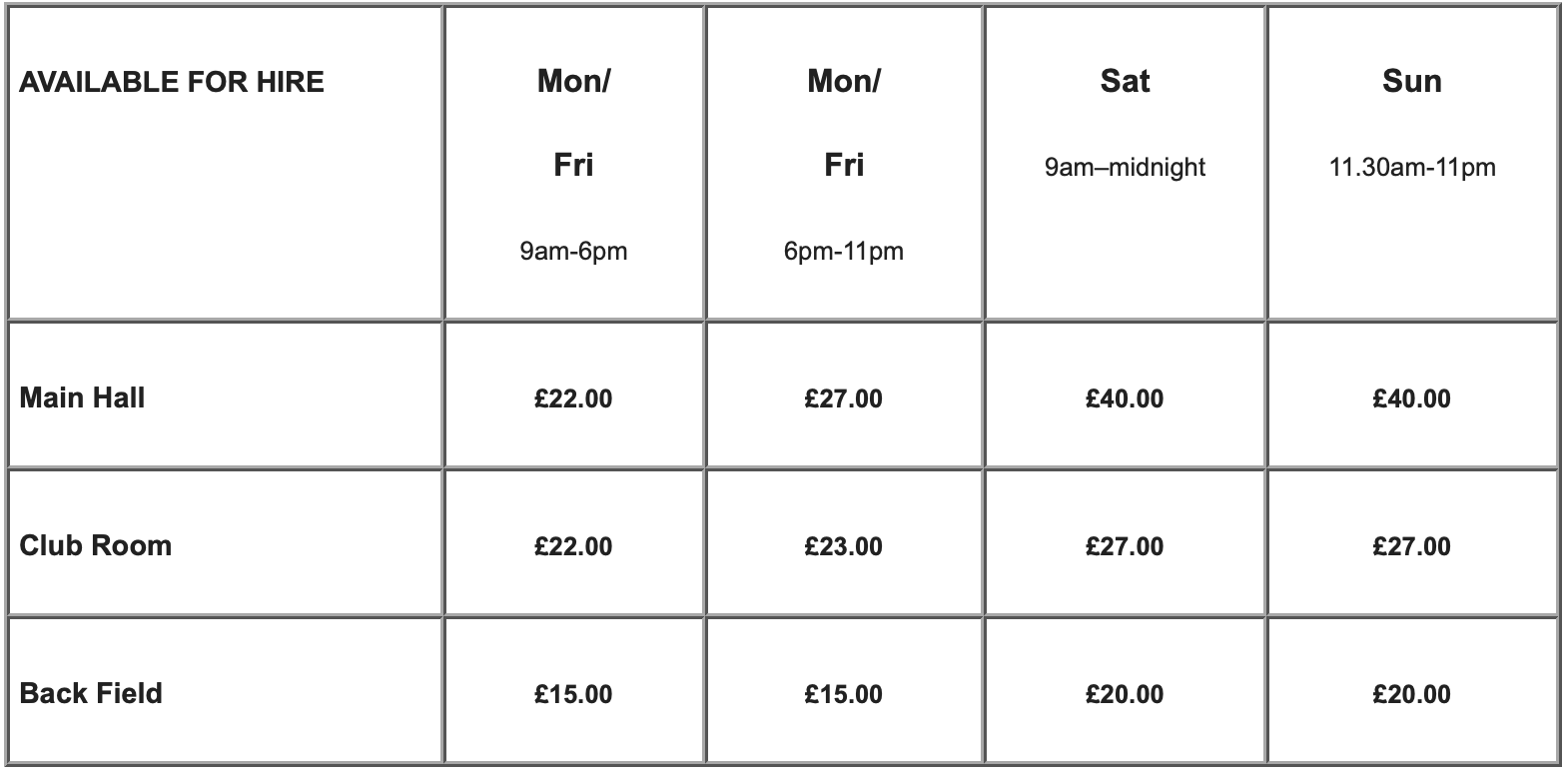 - Consult the Price Table for booking prices (per hour).